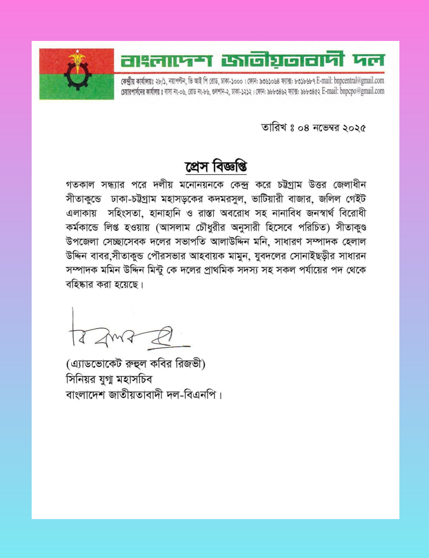 বুধবার রাতে বিএনপির কেন্দ্রীয় দপ্তর থেকে পাঠানো এক প্রেস বিজ্ঞপ্তিতে জানানো হয়, গতকাল সন্ধ্যার পর সীতাকুন্ডের ঢাকা-চট্টগ্রাম মহাসড়কের কদমরসুল, ভাটিয়ারী বাজার ও জলিল গেইট এলাকায় সংঘর্ষ, রাস্তা অবরোধসহ নানাবিধ অপরাধমূলক কর্মকাণ্ডে জড়িত থাকার প্রমাণ পাওয়ায় সংশ্লিষ্টদের বিরুদ্ধে দলীয় সিদ্ধান্ত নেওয়া হয়েছে।